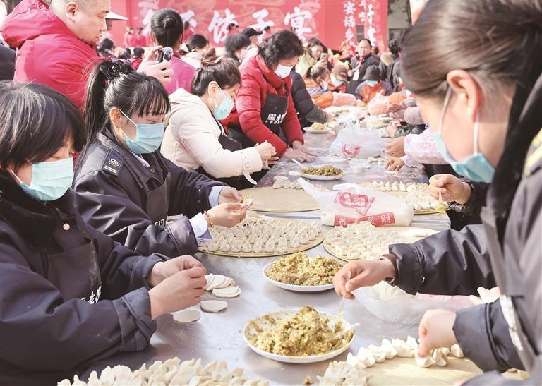 “搟皮的快跟上!餡要多放才香!”“出鍋嘍——熱餃子來了!”12月21日冬至當天,陜西省禮泉縣煙霞鎮(zhèn)袁家村的中心廣場上熱氣蒸騰,第二屆千人餃子宴正式開席。揉面聲、剁餡聲、歡笑聲交織在一起,10萬個鮮香四溢的餃子免費派送,上千名游客與村民圍坐一堂,在熱氣中感受“冬至大如年”的團圓暖意。